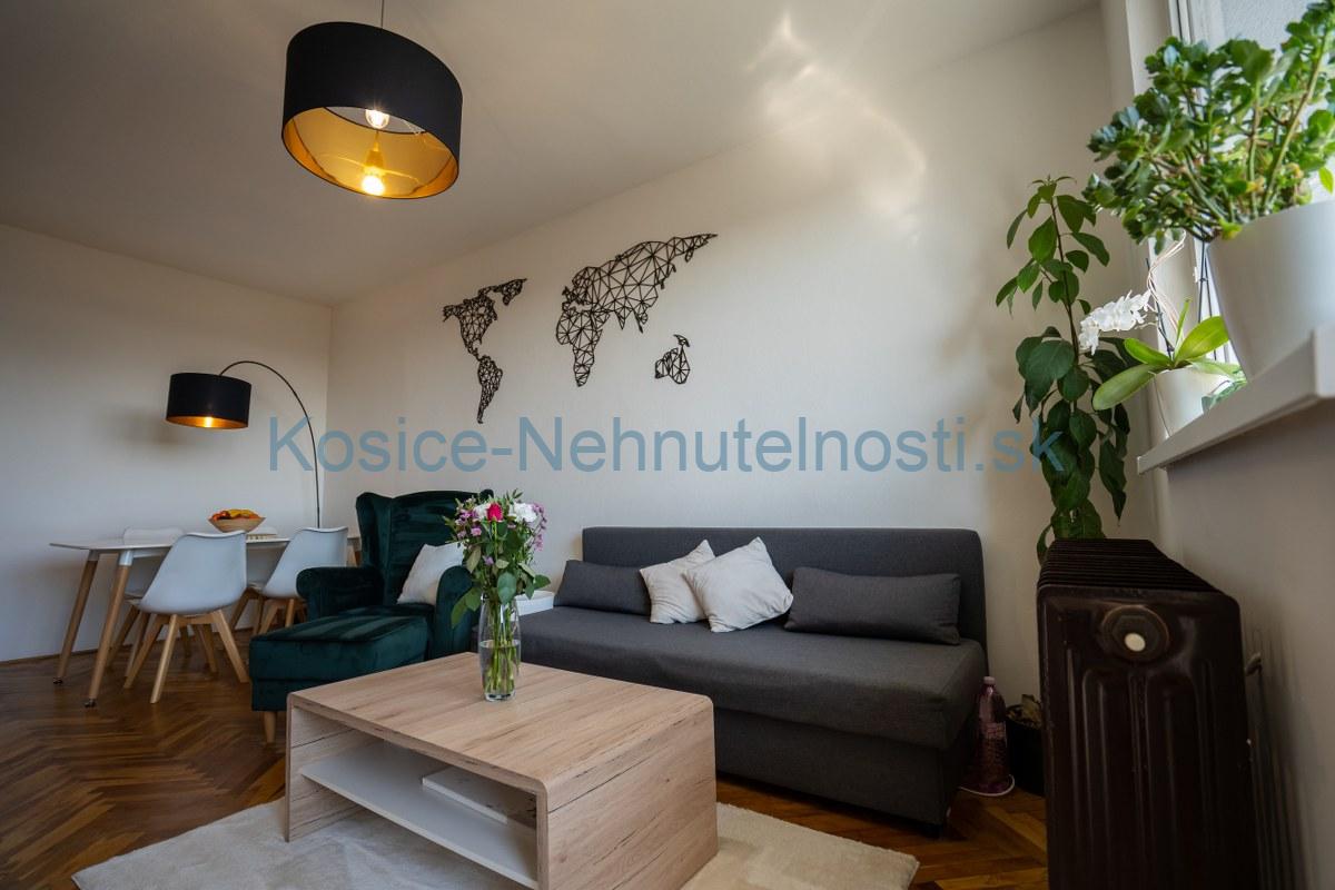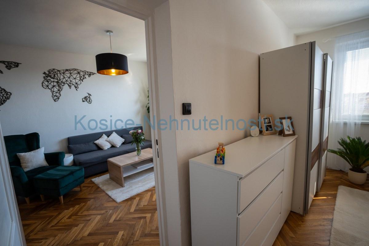 Byt je kompletne zrekonštruovaný: nová kuchynská linka, zabudované spotrebiče: plyn. varná doska, el. rúra, umývačka riadu – ostávajú v byte. V celom byte sú plastové okná. Drevené parkety sú vynovené a ošetrené, murované jadro, nový sprchovací kút aj WC.